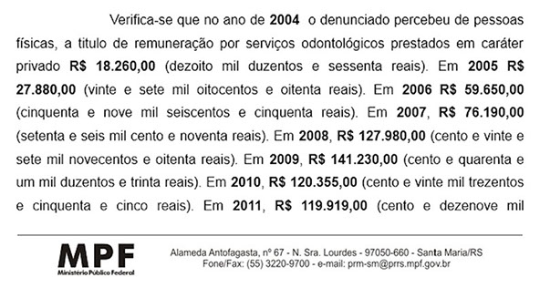 Conforme planilha apresentada pela UFSM, os valores recebidos por um dos denunciados, entre abril de 2007 e abril de 2012, a título de Dedicação Exclusiva, foram de R$ 302.259,10. Só que no mesmo período ele obteve outros R$ 583 mil atuando como dentista em consultórios privados, apurou a polícia.