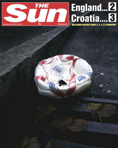 Um dia após a vexatória derrota da Inglaterra nas Eliminatórias da Euro 2008 para a Croácia, que custou a vaga para a competição européia, a imprensa inglesa não poupou a seleção do país. Como sempre, o tablóide The Sun foi o mais enfático. Inútil, patética, insípida, lixaredo, desesperada foram alguns dos adjetivos que abriram a matéria do jornal sobre o jogo.