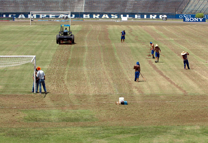 O trabalho foi dividido em etapas. Segunda-feira, uma raspagem do gramado encheu 10 contêineres com o excesso de palha acumulada durante o ano. Hoje o campo foi transformado em areião. Amanhã haverá a remoção de "charutos" de solo compactado, o que exige a abertura de buracos com 20 centímetros de profundidade, que permitirão que a água da chuva seja absorvida com maior rapidez.