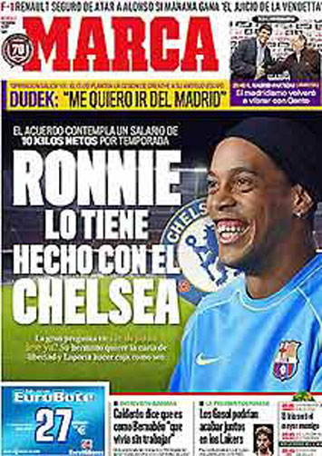 A possível transferência do meia-atacante brasileiro Ronaldinho, do Barcelona para o Chelsea, é o destaque da imprensa esportiva espanhola. Segundo o jornal Marca, o jogador já teria praticamente acertado um acordo com o clube inglês, pelo qual receberia 10 milhões de euros por ano e se transferiria já em janeiro.