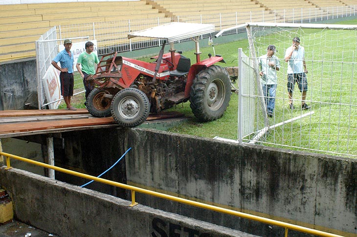 Um trator que trabalhava na substituição do gramado do Heriberto Hülse, em Criciúma, quase caiu no fosso do estádio na manhã desta quarta-feira. Um caminhão foi até o local para retirar o veículo.