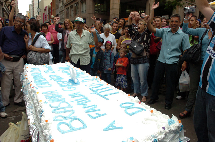 Torcedores do Grêmio se concentraram na manhã desta terça na Esquina Democrática, na Avenida dos Andradas com a Borges de Medeiros, em Porto Alegre, para comer um bolo em comemoração dos 24 anos da conquista do título Mundial de Clubes, no Japão.