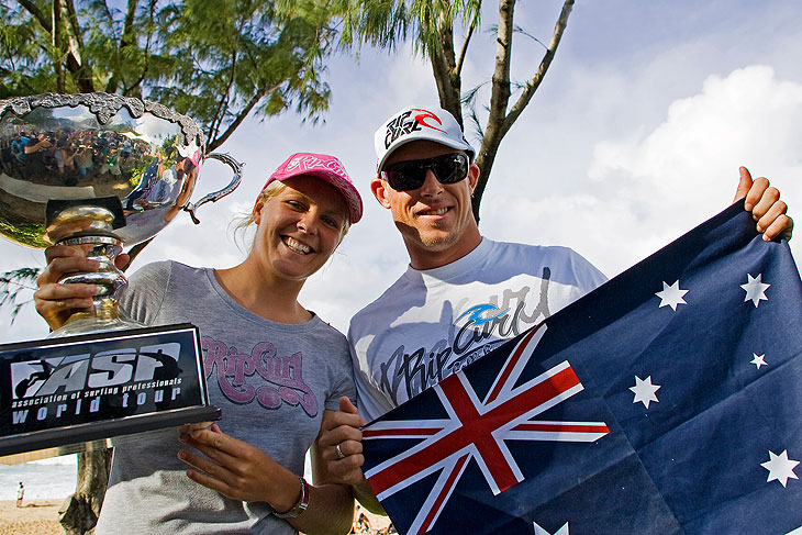 Ele quebrou um jejum de sete anos para seu país. Ela, aos 19 anos, tornou-se a primeira estreante a conquistar o título mundial. Mick Fanning e Stephanie Gilmore se encontraram no domingo numa Pipeline com poucas ondas, mas nem por isso menos charmosa. Celebraram um feito que há tempos não acontecia. Segundo informações do Globoesporte.com, a última vez que a Austrália conquistou dois títulos mundiais foi em 1999, com Mark Occhilupo e Layne Beachley.