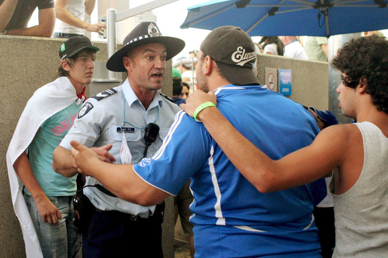 Uma ação da polícia contra um grupo de torcedores gregos manchou a estréia do chileno Fernando González, vice-campeão do último Aberto da Austrália, na competição deste ano, batendo Konstantinos Economidis, da Grécia, por 6-4, 7-6(7-2) e 6-1. O jogo, disputado na quadra Margaret Court, teve de ser interrompido durante cerca de cinco minutos no segundo set. Na ação, os policiais usaram sprays de pimenta contra três gregos.