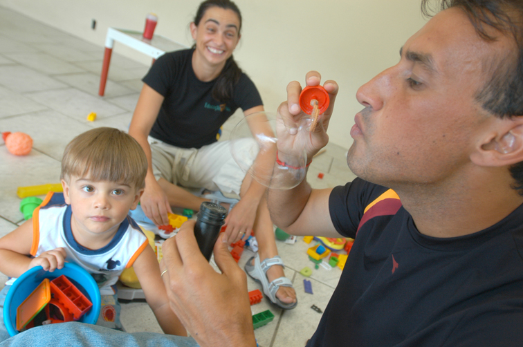 Claudio Milar um dia depois do gol cem pelo Brasil de Pelotas brinca com o filho Agustin e a esposa Caroline em casa