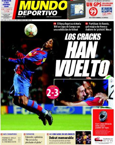 As publicações catalães nesta quinta-feira exaltam a boa atuação de Ronaldinho, assim como a de todo o time do Barcelona, na vitória sobre o Celtic, por 3 a 2, pelas oitavas-de-final da Liga dos Campeões. Adjetivos como "fantástico" e "maravilhoso" são repetidos a exaustão nos jornais da região. O craque brasileiro estampa a capa do El Mundo Deportivo, que escreve: "Os craques voltaram". Já o diário Sport diz que o quarteto fantástico (formado por Messi, Henry, Eto´o e Ronaldinho) finalmente entrou em ação. As informações são do globoesporte.com.