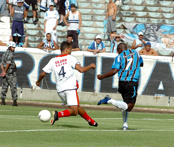 O Grêmio não encontrou dificuldades para se impor diante do adversário. Hidalgo e Paulo Sérgio tinham liberdade para avançar e fazer cruzamentos em busca de Soares e Perea, que não davam descanso aos zagueiros da Ulbra. Willian Magrão era outro que mostrava competência e velocidade na hora de servir os homens de frente. Mas o primeiro gol, surgiu mesmo da parceria do meio-campo que pela primeira vez neste sábado iniciou uma partida: Julio dos Santos e Roger.