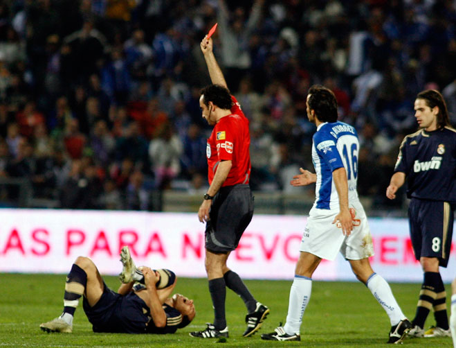 Robben (no chão) se machuca após levar entrada dura na vitória do Real Madrid sobre Recreativo Huelva