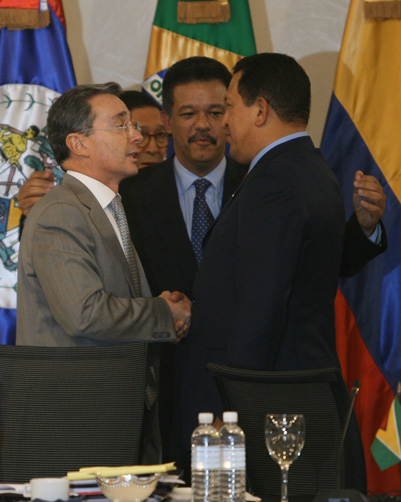 O presidente colombiano, Álvaro Uribe, deu hoje por liquidadas suas diferenças com Equador, Venezuela e Nicarágua com apertos de mão e abraços, em um gesto de compromisso de trabalhar em favor da paz. O presidente dominicano, Leonel Fernández, pediu a seus colegas de Colômbia, Equador (Rafael Correa) e Venezuela (Hugo Chávez) que reafirmem sua disposição para a paz dando as mãos.