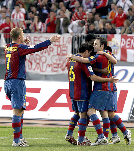 Um gol sofrido aos 39 minutos do segundo tempo atrapalhou os planos do Barcelona de se aproximar do Real Madrid na liderança do Campeonato Espanhol. Jogando em Almería com muitos desfalques, a equipe do técnico Frank Rijkaard empatou por 2 a 2 com o time da casa e ficou a sete pontos do líder Real Madrid.