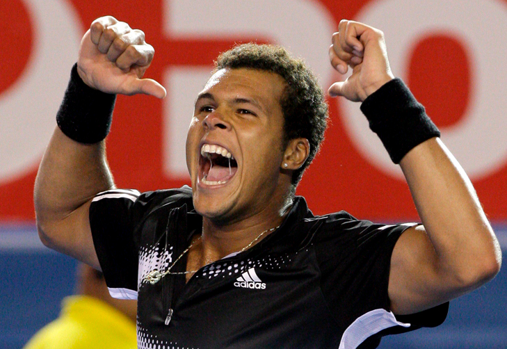 O tenista francês Jo-Wilfried Tsonga comemora vitória contra Nadal na partida das semifinais do Aberto da Austrália de 2008