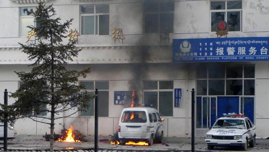 Carros da polícia chinesa foram queimados em frente ao edifício governamental em Maqu City, na província de Gansu