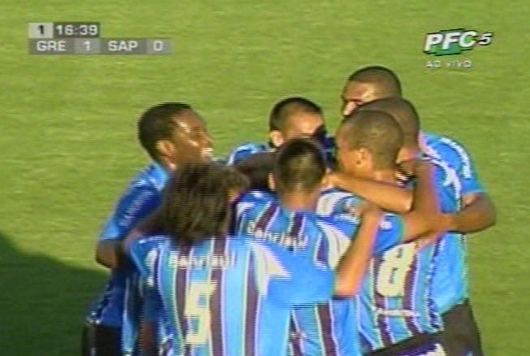 Paulo Sérgio confirma sua ótima fase em cobranças de falta e abre o placar para o Grêmio, aos 15 minutos, no Olímpico. A jogada começou com Reinaldo, que em troca de passes pelo meio com Julio dos Santos foi derrubado na entrada da área. O lateral-direito cobrou com perfeição, no canto direito do goleiro Eliandro, que nem se mexeu para tentar a defesa.