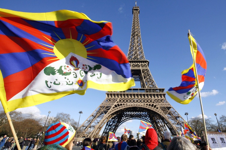 Os manifestantes, convocados pela chamada Comunidade Tibetana da França, se reuniram primeiro na Praça Trocadero e a partir dali desfilaram até a Torre Eiffel, na frente de turistas. Os participantes do protesto levavam bandeiras com o lema "Tibete livre" e "China mente, o Tibete morre", além de fotografias de pessoas que se identificavam como vítimas da repressão das autoridades chinesas.