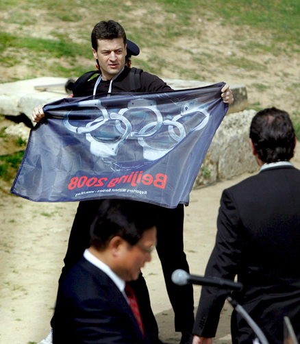 Um ativista a favor de um boicote dos Jogos Olímpicos de Pequim conseguiu entrar no estádio de Antiga Olímpia durante o discurso de Liu Qi, presidente do Comitê Organizador dos Jogos, pouco antes da cerimônia na qual a chama olímpica foi acesa, na manhã de hoje (horário do Brasil).