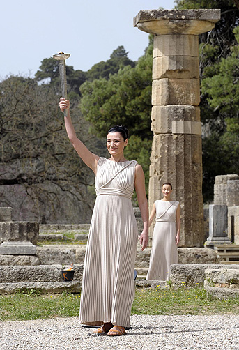No local arqueológico de Olímpia, berço natal dos Jogos há 2.800 anos, 22 mulheres vestidas com túnicas brancas - como sacerdotisas - entraram nas ruínas do templo de Hera ao compasso dos tambores. A tocha foi acessa a partir dos raios de sol, com a ajuda de um espelho côncavo.