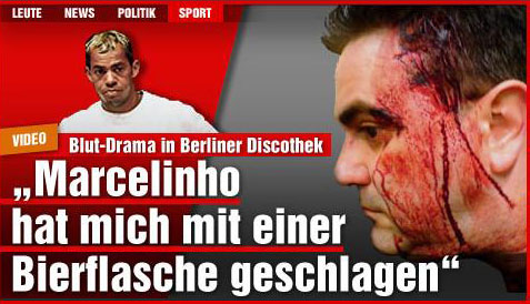 O meia Marcelinho Paraíba brigou com um homem de 44 anos em uma discoteca de Berlim, na noite do último domingo, e foi denunciado por agressão. A possível vítima do brasileiro aparece com a cabeça ensangüentada na capa do jornal alemão Bild desta terça-feira.