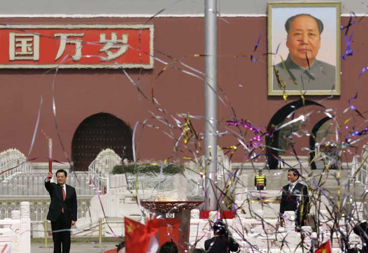 O périplo que a chama fará pelo mundo começou oficialmente quando o desportista chinês Liu Xiang, recordista mundial de 110 metros com barreiras e campeão olímpico, tomou a tocha olímpica das mãos de Hu Jintao.