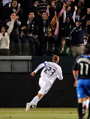 O meia inglês David Beckham anotou seu primeiro gol na MLS, a principal liga de futebol dos Estados Unidos. Na noite desta quinta, ele ajudou o Los Angeles Galaxy a vencer por 2 a 0 o San Jose Earthquakes na segunda rodada do campeonato, em casa, na noite de quinta-feira.