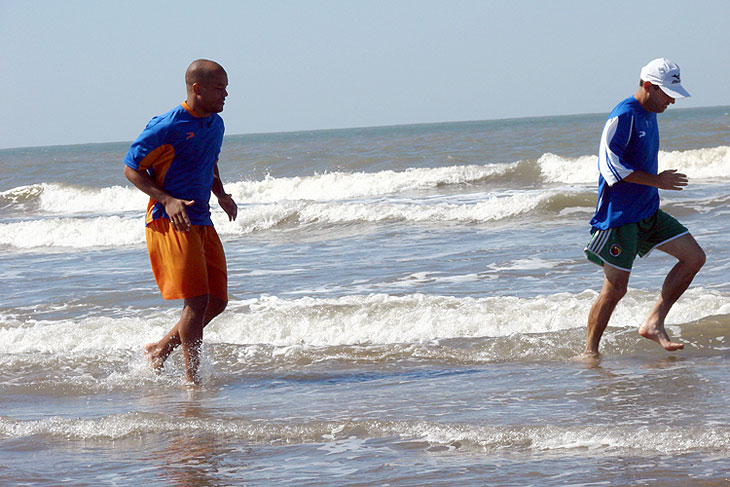 Todos os jogadores participaram do treinamento na praia do Cassino. Até mesmo o volante Cléber, que desfalcou o time por lesão nas últimas rodadas, treinou normalmente na areia do balneário e está próximo de retornar aos jogos do Vovô na Segundona.