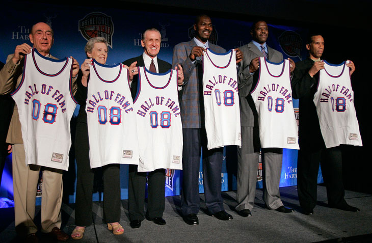 Da esquerda para a direita: Dick Vitale, Cathy Rush, Pat Riley, Hakeem Olajuwon, Patrick Ewing e Adrian Dantley