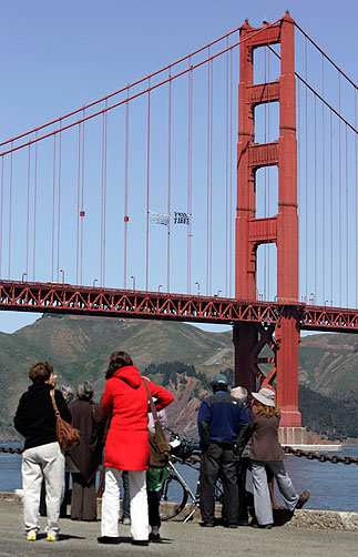 Em solo norte-americano, a chama foi levada de carro para um local não revelado, de onde partirá nesta quarta-feira para o revezamento na cidade. Na chegada não houve protestos, mas um grupo de ativistas pendurou faixas com frases como "Free Tibet" (Tibete Libre) na ponte Golden Gate, cartão postal da cidade.