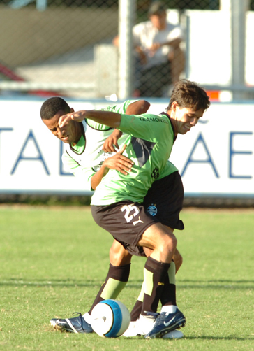 O time titular no treino desta tarde foi armado por Celso Roth no esquema 3-5-2. A escalação foi a seguinte: Marcelo Grohe; Leo, Jean e Thiego; Paulo Sérgio, Rafael Carioca, William Magrão, André Luís e Helder; Jonas e Perea.