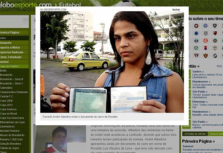 O atacante Ronaldo, do Milan, se envolveu em polêmica na madrugada desta segunda-feira, segundo informações do Globoesporte.com. Após ter ido a uma boate no Rio de Janeiro, o craque terminou a noitada na 16ª Delegacia de Polícia (Barra da Tijuca), depois de uma confusão com o travesti André Luis Ribeiro Albertino, conhecido como Andréia Albertine.