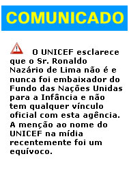 O Fundo das Nações Unidas para a Infância (Unicef) divulgou nesta segunda uma nota no site oficial afirmando que Ronaldo não é embaixador da entidade, como vem sendo divulgado pela mídia. Na verdade, o Fenômeno é embaixador da boa-vontade do Programa das Nações Unidas para o Desenvolvimento (PNUD).