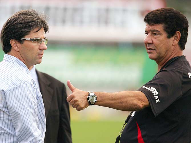 Ao lado de Joel Santana, a quem está substituindo, Caio Júnior foi apresentado na tarde desta terça-feira como novo treinador do Flamengo. Esbanjando bom humor, o novo comandante brincou com o fato de seu antecessor ter a fama de 'paizão' no elenco.
