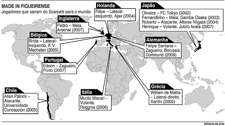A lista de nomes made in Scarpelli que ganharam o mundo nesta fase é encabeçada pelo meia Oliveira. Em 2002, no ano que marcou o retorno alvinegro à Série A, o garoto foi negociado com o FC Tokyo, do Japão. No ano seguinte, o Figueirense revelou o meia Fernandinho, baixinho habilidoso que se transferiu para o Gamba Osaka, do Japão, depois de uma "ponte" no São Caetano. Ele continua no Japão, onde defende o Shimizu Pulse.
