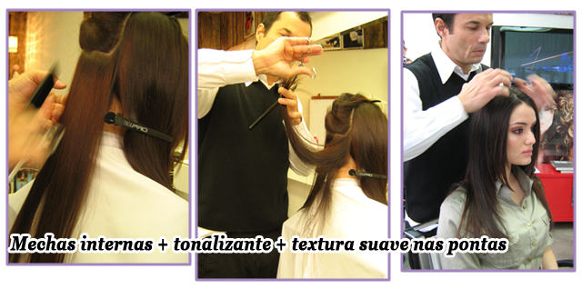 Foram feitas mechas internas no cabelo, tonalizado com uma cor puxando para um tom de amêndoa.