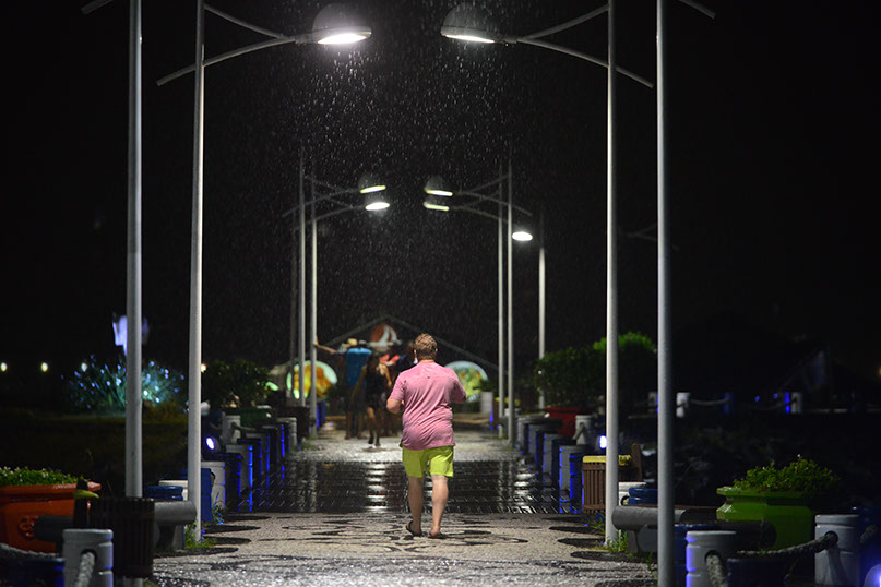 Mesmo com chuva, o molhe na Barra Sul recebe visitantes durante a noite
